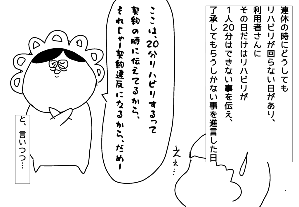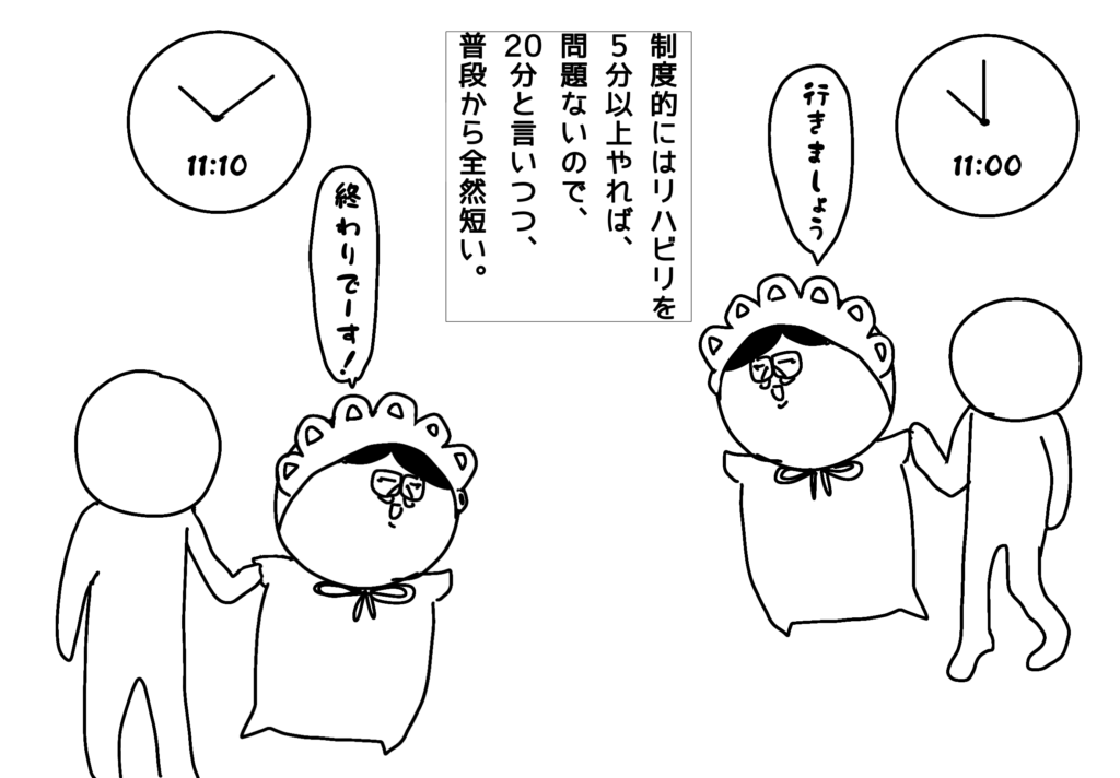 制度的には5分やろうか20分やろうが、料金は変わらないので、契約の時にリハビリを売りにしていても、特に罪には問われないので人によっては短く対応しても構わないと思いますが。