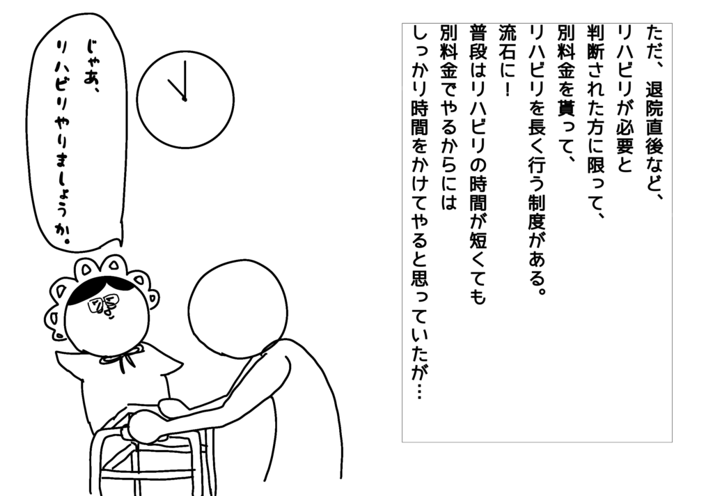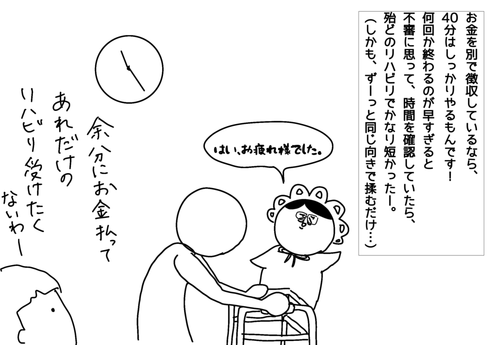 何が納得できないかと言うと、お金を払ってまでしっかりやってもらいたい人に短時間しか介入しないこと、後はマッサージしかしないことです。