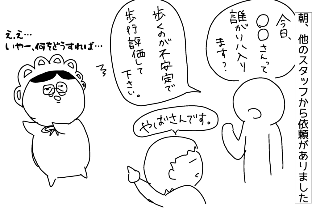リハビリの評価で他のスタッフは介助するので、評価依頼があれば早めにリハビリに入るものですが、朝言われて、なぜいまの今まで入らなかったんだ!!と思いません?