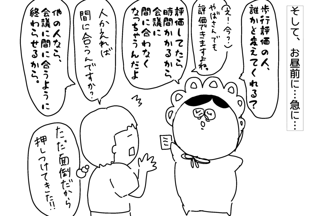 これは、リハビリの役目なので、到底やば上司もできるはず…と思っていましたが、おっとどっこい!