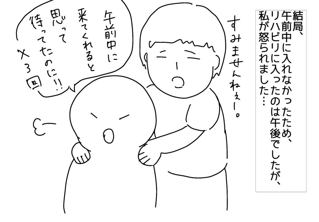 完全にとばっちりだー!と思いながら、利用者さんの訴えを聞き、歩行評価の時間より早めにリハビリに入らなかったことをネチネチ言われました…。