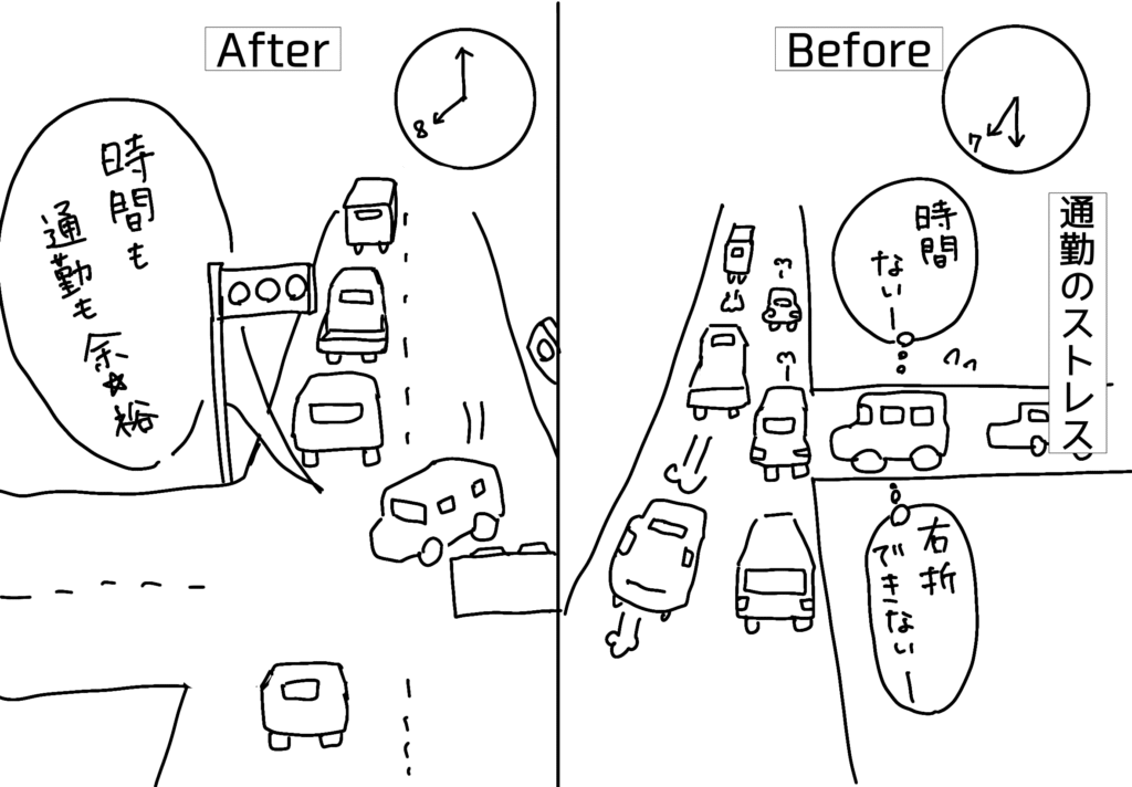 職場が近く、郊外になったことで出勤時間、所要時間が短縮し、家事の時間の確保や通勤時の運転時のストレスが減少しました。
