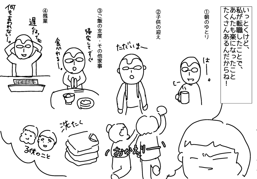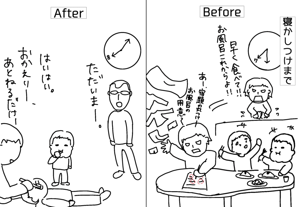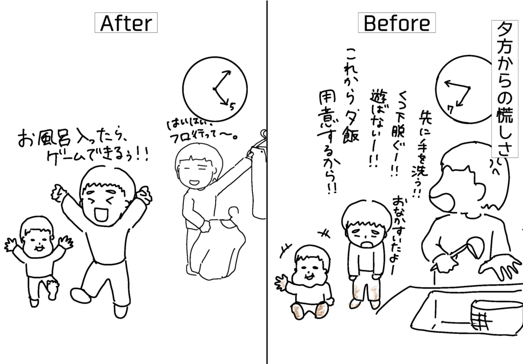 今までは21時には子供を寝かしつけなくてはという制限時間に追われ、イライラしながら家事を遂行することがほとんど。子供も最後まで保育園や児童館にいることで多分ストレスや疲労は結構なものだったと思います。帰宅時間が早くなったことで、時間に余裕が生まれ、お互い心穏やかに遂行できるようになりました。