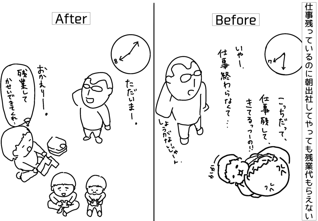 何がって、仕事が終わらなくても時間は待ってくれません。配慮してくれない職場と終わらない仕事…夜だったら残業でお給料も貰えるのに、前日の仕事を朝早くいってやっても朝は残業取れない!何て理不尽なんでしょう!!